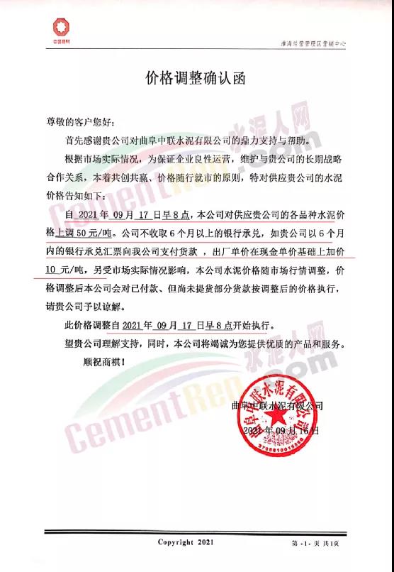 中聯(lián)水泥淮海運營區(qū)曲阜中聯(lián)水泥有限公司通知根據(jù)市場實際情況,為保證企業(yè)良性運營,自9月17日早8點各品種水泥價格上調(diào)50元/噸。公司不收取6個月以上的銀行承兌,如貴公司以6個月內(nèi)的銀行承兌匯票向我公司支付貨款,出廠單價在現(xiàn)金單價基礎(chǔ)上加價10元/噸,另受市場實際情況影響,本公司水泥價格隨市場行情調(diào)整,價格調(diào)整后本公司會對已付款、但尚未提貨部分貨款按調(diào)整后的價格執(zhí)行。