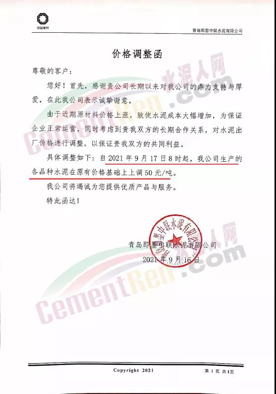 青島即墨中聯(lián)水泥有限公司通知,由于近期原材料價格上漲,致使水泥成本大幅增加,為保證企業(yè)正常運營,自2021年9月17日8時起,公司生產(chǎn)的各品種水泥在原有價格基礎(chǔ)上上調(diào)50元/噸。
