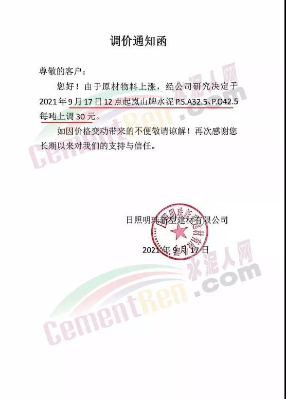 日照明珠新型建材有限公司通知,由于原材物料上漲,經(jīng)公司研究決定于2021年9月17日12點起嵐山牌水泥PS.A32.5、P.O42.5每噸上調(diào)30元。