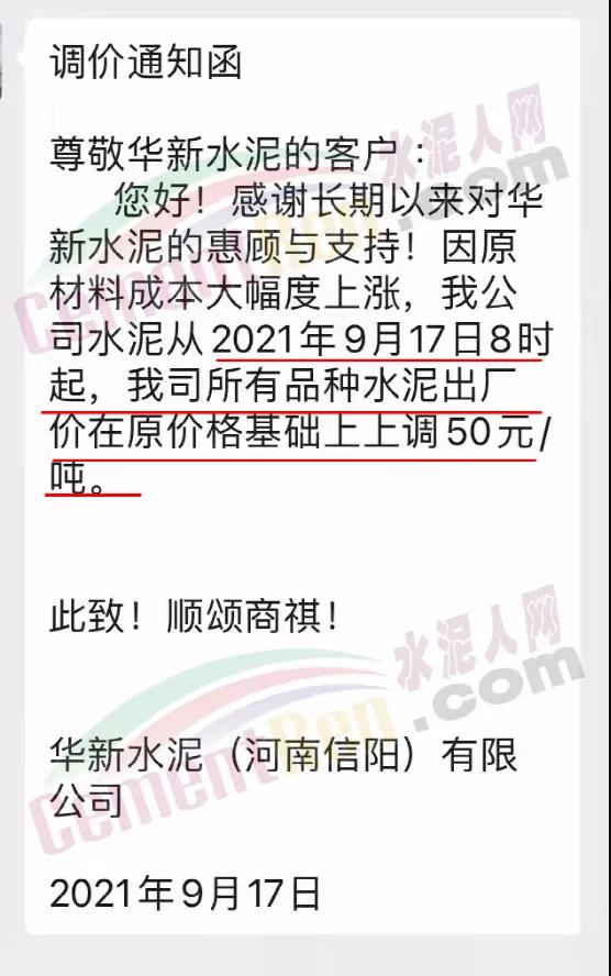 相關(guān)市場人士表示,山東漲價對河南區(qū)域也是個利好消息,華新水泥(河南信陽)有限公司通知因原材料成本大幅度上漲,公司水泥從2021年9月17日8時起,我司所有品種水泥出廠價在原價格基礎(chǔ)上上調(diào)50元/噸。
