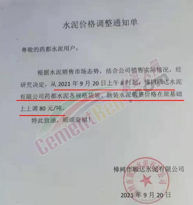 9月20日,江西地區(qū)樟樹市順達(dá)水泥有限公司發(fā)布通知稱:根據(jù)水泥銷售市場態(tài)勢,結(jié)合公司銷售實(shí)際情況,經(jīng)研究決定,自2021年9月20日上午8時起,樟樹順達(dá)水泥有限公司藥都水泥各規(guī)格袋裝、散裝水泥銷售價格在原基礎(chǔ)上上調(diào)80元/噸。