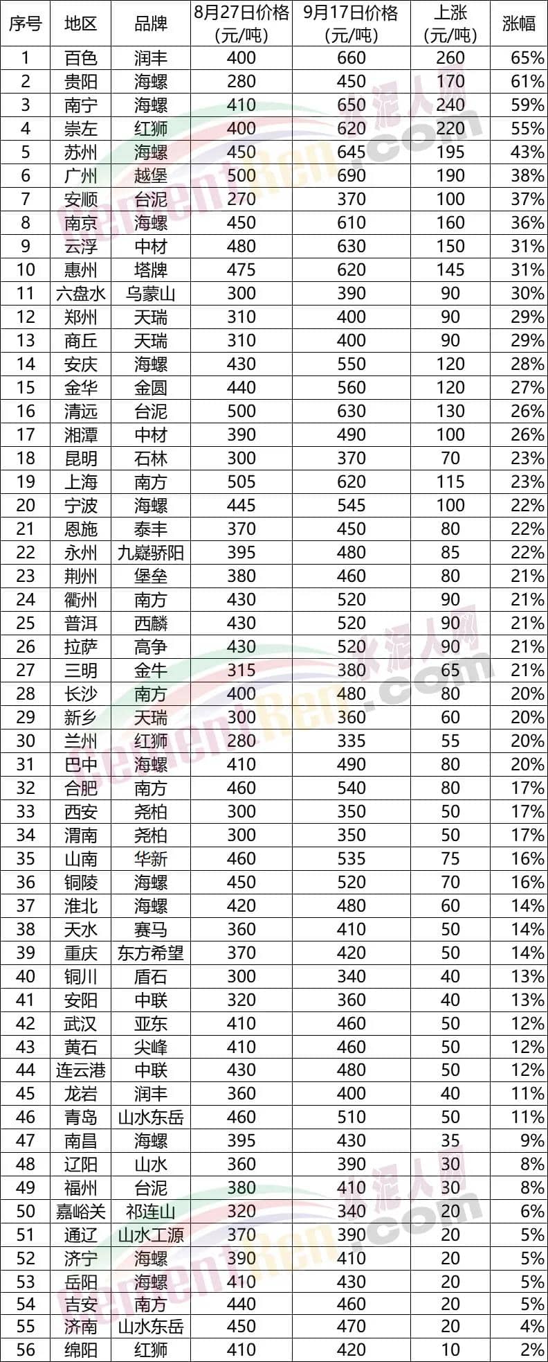 全國56個地區(qū)PO42.5散裝水泥價格漲幅榜