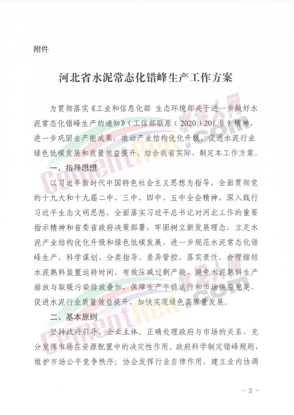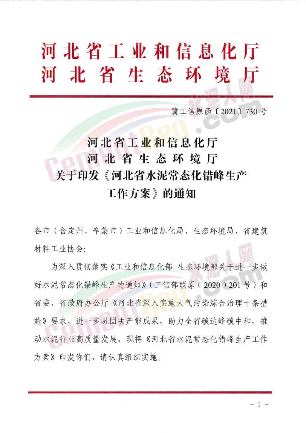 日前,河北省工業(yè)和信息化廳聯(lián)合河北省生態(tài)環(huán)境廳發(fā)布關于印發(fā)《河北省水泥常態(tài)化錯峰生產(chǎn)工作方案》的通知給各市(含定州、辛集市)工業(yè)和信息化局、生態(tài)環(huán)境局、省建筑材料工業(yè)協(xié)會稱,為深入貫徹落實《工業(yè)和信息化部生態(tài)環(huán)境部關于進一步做好水泥常態(tài)化錯峰生產(chǎn)的通知》(工信部聯(lián)原〔2020)201號)和省委、省政府辦公廳《河北省深入實施大氣污染綜合治理十條措施》要求,進一步鞏固去產(chǎn)能成果,助力全省碳達峰碳中和,推動水泥行業(yè)高質(zhì)量發(fā)展,印發(fā)《河北省水泥常態(tài)化錯峰生產(chǎn)工作方案》,請認真組織實施。