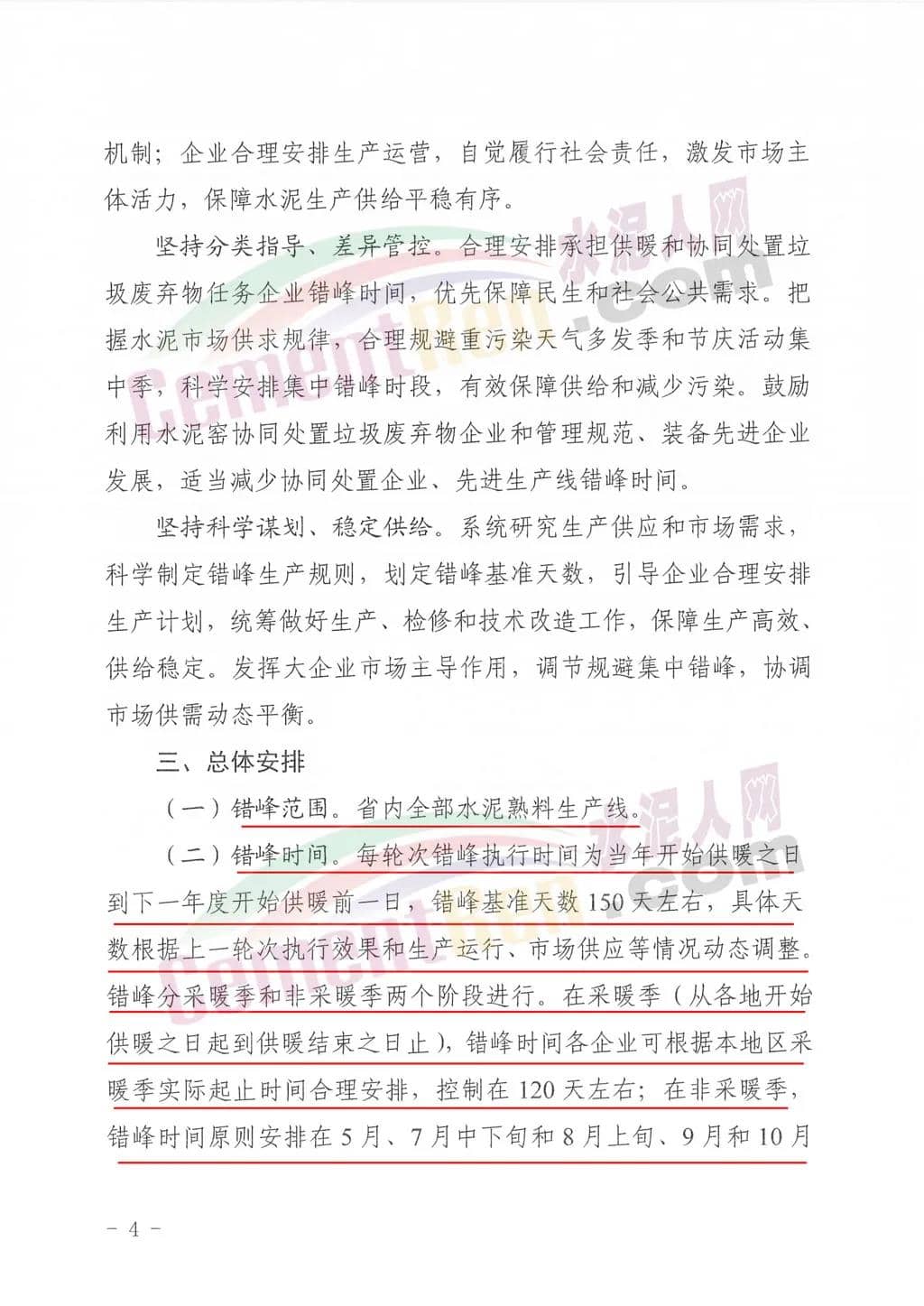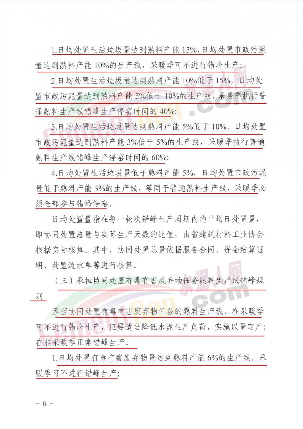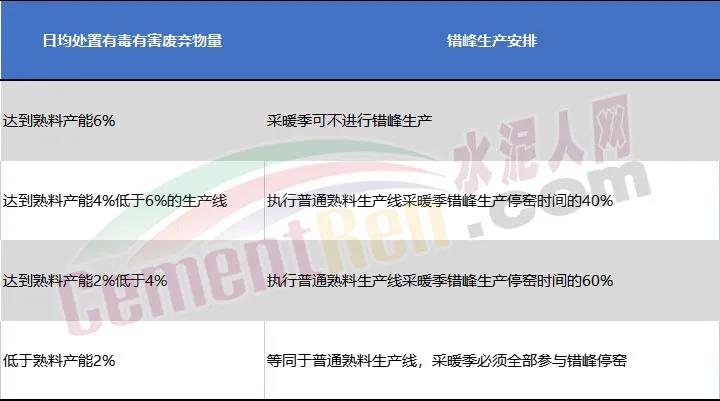 承擔協(xié)同處置有毒有害廢棄物任務熟料生產(chǎn)線錯峰規(guī)則承擔協(xié)同處置有毒有害廢棄物任務的熟料生產(chǎn)線,在采暖季可不進行錯峰生產(chǎn),但要適當降低水泥生產(chǎn)負荷,實施以量定產(chǎn);在非采暖季正常錯峰生產(chǎn)。