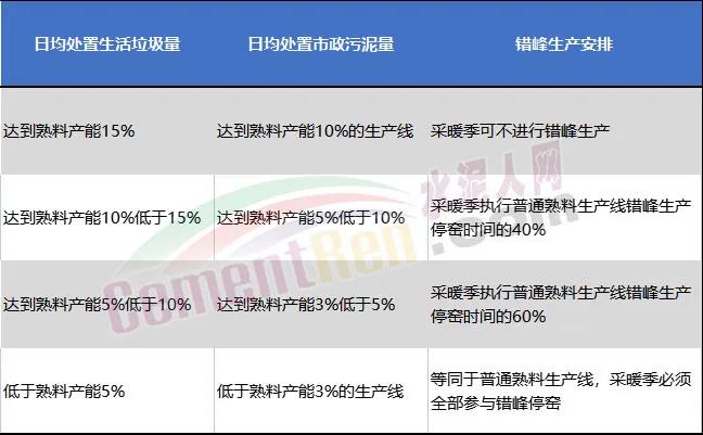 承擔協(xié)同處置城市生活垃圾及市政污泥等任務的熟料生產(chǎn)線,在采暖季可不進行錯峰生產(chǎn),但要適當降低水泥生產(chǎn)負荷,實施以量定產(chǎn);在非采暖季正常錯峰生產(chǎn)。