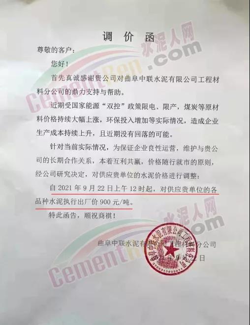 近日,曲阜中聯(lián)水泥有限公司工程材料分公司通知,近期受國家能源“雙控”政策限電、限產(chǎn),煤炭等原材料價格持續(xù)大幅上漲,環(huán)保投入增加等實際情況,造成企業(yè)生產(chǎn)成本持續(xù)上升,且近期沒有回落的可能。針對當前實際情況,為保證企業(yè)良性運營,經(jīng)公司研究決定,自2021年9月22日上午12時起,各品種水泥執(zhí)行出廠價900元/噸。
