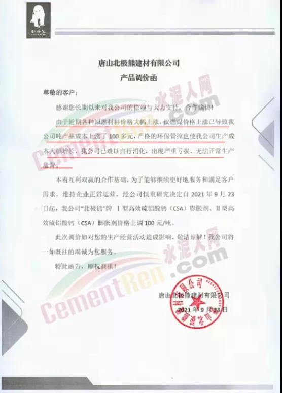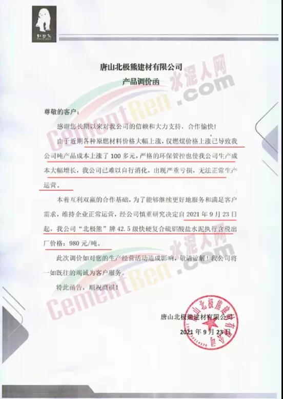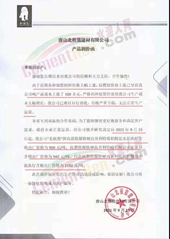 特種水泥方面,不僅山東區(qū)域,河北區(qū)域也有多家特種水泥企業(yè)上調(diào)水泥價格。唐山北極熊建材有限公司連發(fā)三份產(chǎn)品調(diào)價函稱,由于近期各種原燃材料價格大幅上漲,僅燃煤價格上漲已導致公司噸產(chǎn)品成本上漲了100多元,為了能夠維續(xù)更好地服務和滿足客戶需求,維持企業(yè)正常運營。