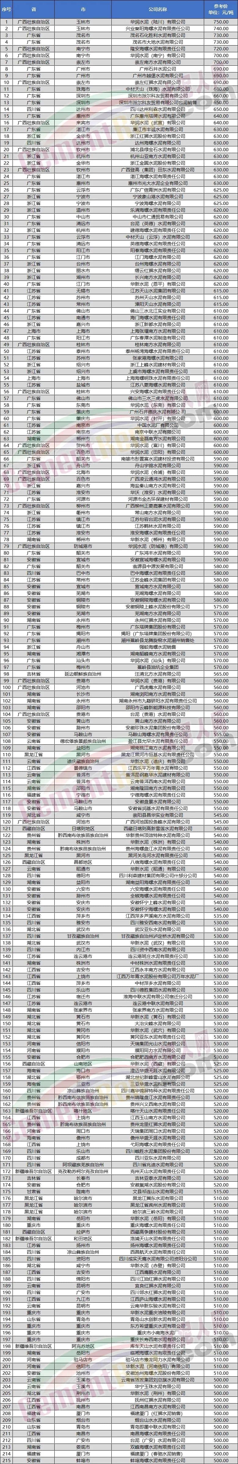 ?水泥人網(wǎng)信息中心重點監(jiān)管的千余家水泥企業(yè)水泥價格數(shù)據(jù)顯示,有216家企業(yè)出廠參考價500元/噸及以上,有近一半的企業(yè)到位價在500元/噸及以上。