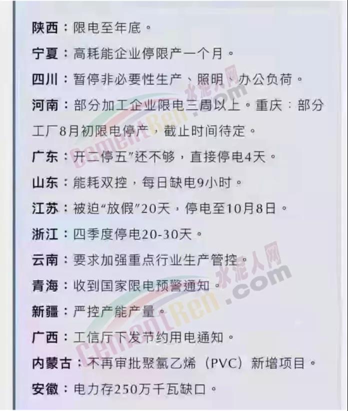 “不定期、不定時、無計劃、無通知停電限電,或將持續到2022年3月份”、“停電、停水或變為常態”、“不僅工業用電被限,民用電也一起被限制了”、“水泥價格還會上漲”... ...