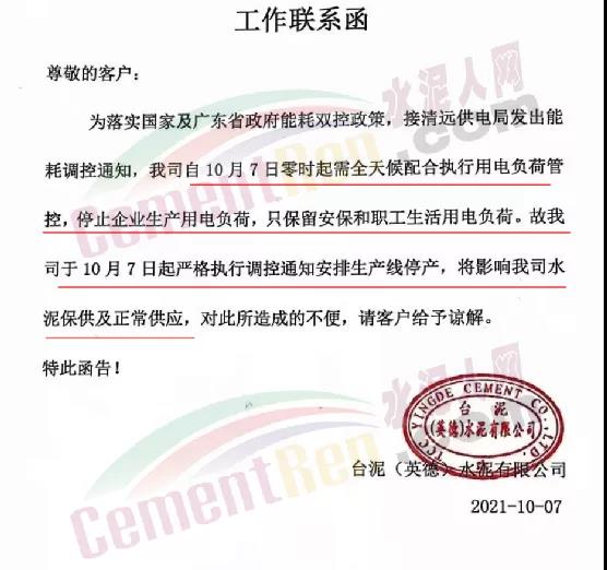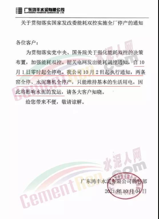 廣東鴻豐水泥有限公司通知為貫徹落實黨中央、國務院關于強化能耗雙控的決策布置,加強能耗雙控。韶關電網發出能耗調控通知,自10月1日零時起全停電。我公司10月2日起執行通知,兩條窯全停、水泥磨機全停產,只能維持基本的生活用電,因此將影響水泥的發運。