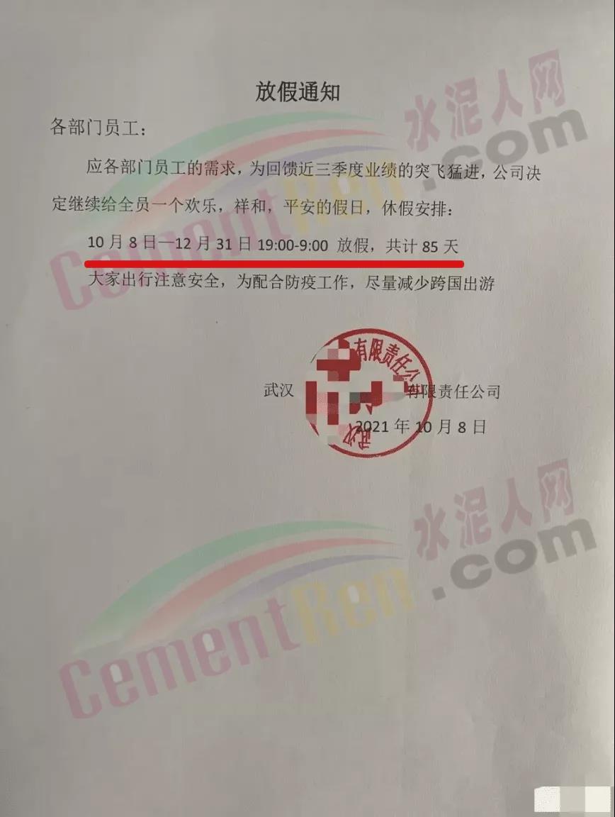 近日,湖北武漢某企業(yè)發(fā)布放假通知,稱(chēng)應(yīng)各部門(mén)員工的需求,為回饋近三季度業(yè)績(jī)的突飛猛進(jìn),決定繼續(xù)給全員一個(gè)歡樂(lè),祥和,平安的假日,休假安排:10月8日一12月31日19:00-9:00放假,共計(jì)85天。