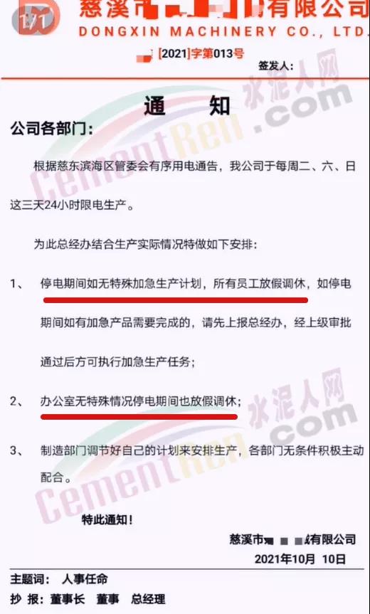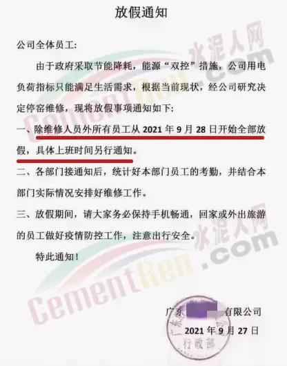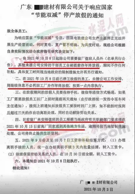 同日,遼寧省遼陽(yáng)市工信局發(fā)布通知要求自2021年10月9日8時(shí)起,對(duì)水泥行業(yè)8戶(hù)熟料企業(yè)、11條熟料生產(chǎn)實(shí)施有序用電措施,期間水泥熟料生產(chǎn)停止用電,有序用電時(shí)間預(yù)計(jì)不低于15天,結(jié)束時(shí)間另行通知。同時(shí)要求對(duì)擅自啟動(dòng)水泥熟料生產(chǎn)用電的企業(yè),要責(zé)令改正,情節(jié)嚴(yán)重的停止供電。
