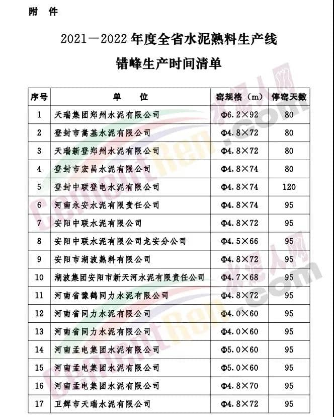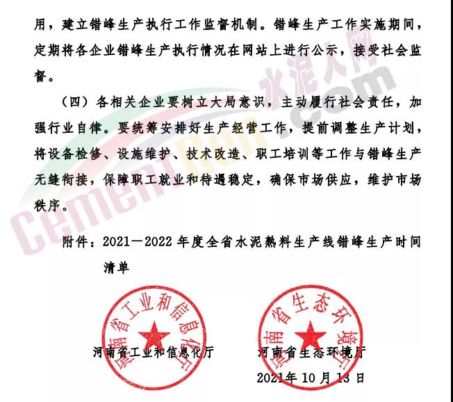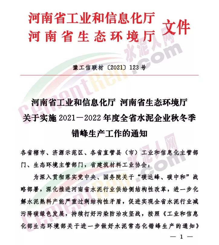 水泥人網通訊員消息,日前,河南河南省工業和信息化廳聯合河南省生態環境廳發布《關于實施2021-2022年度全省水泥企業秋冬季錯峰生產工作的通知》要求,全省所有水泥生產企業2021年11月15日至2022年3月15日期間實施差異化錯峰停產。