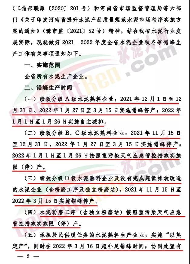 (二)績效分級B、C級水泥熟料企業:2021年11月15日至12月31日,2022年1月27日至3月15日實施錯峰停產;2022年1月1日至1月26日按照重污染天氣應急管控措施實施限(停)產。