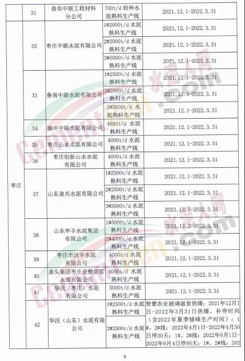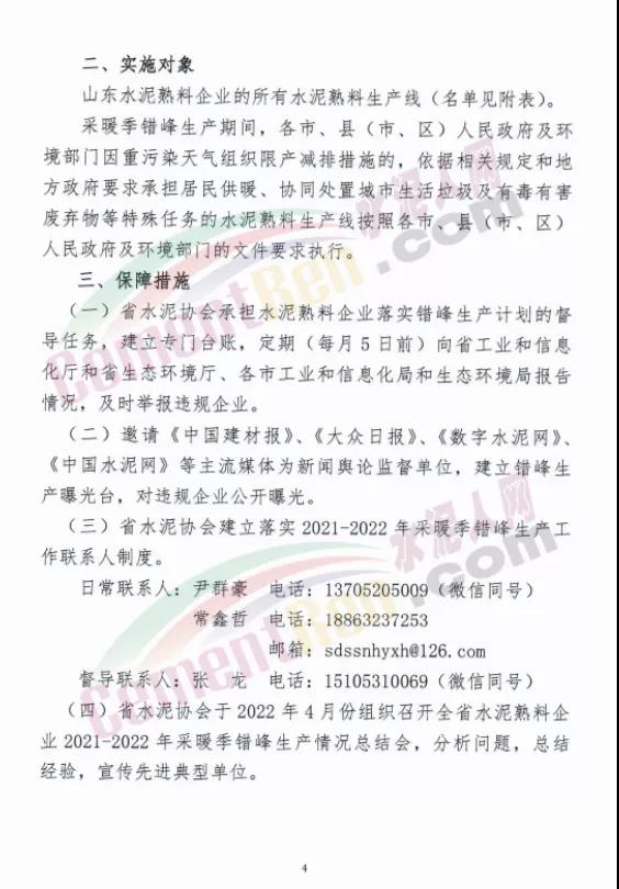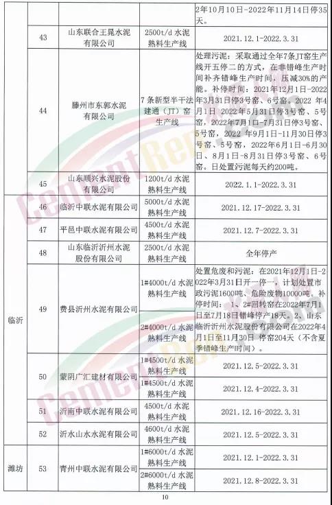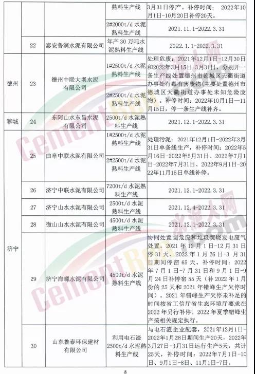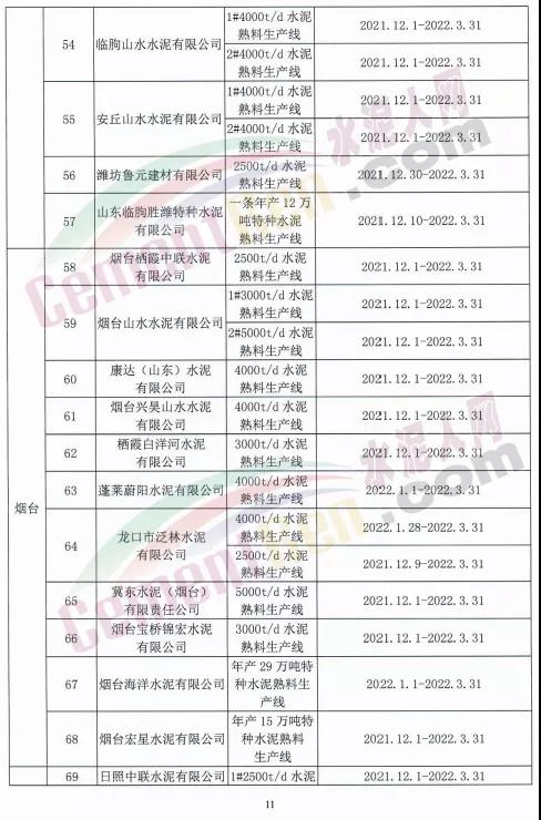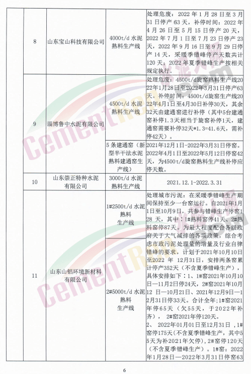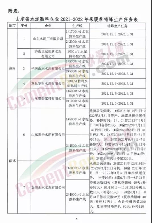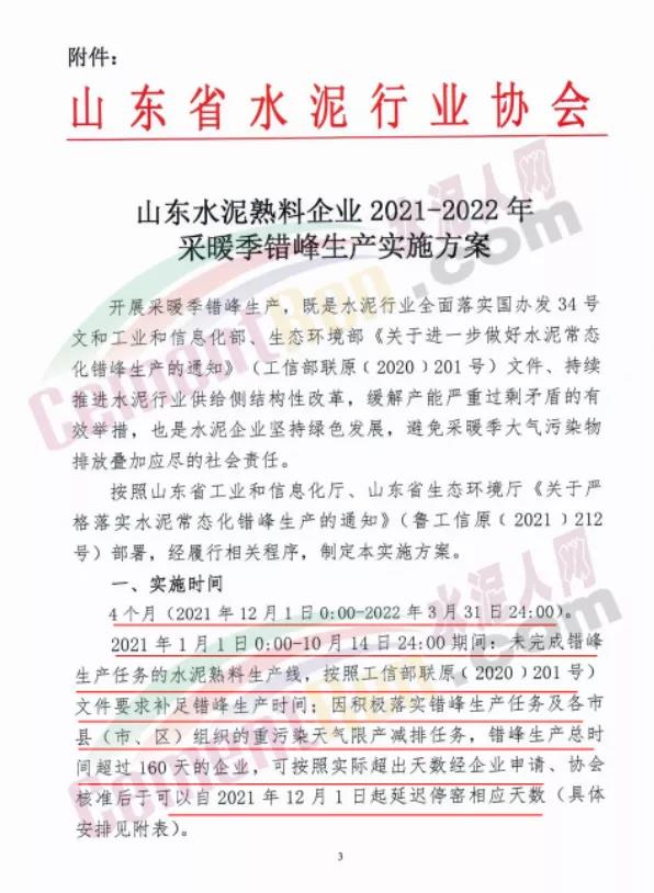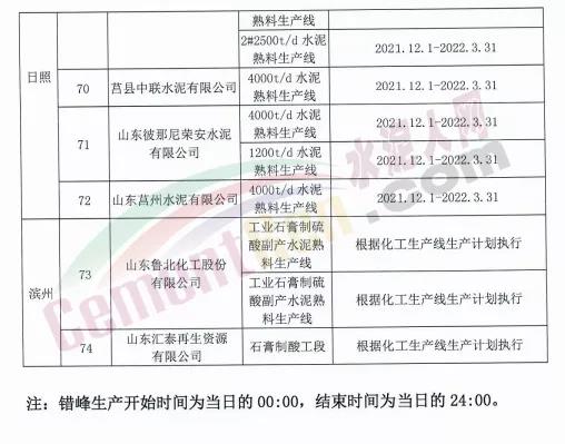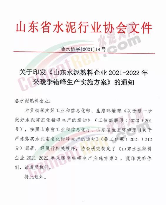 10月15日,山東省水泥行業協會發布山東水泥熟料企業2021-2022年采暖季錯峰生產實施方案要求,山東水泥熟料企業的所有水泥熟料生產線2021年12月1日0:00-2022年3月31日24:00實施錯峰生產。