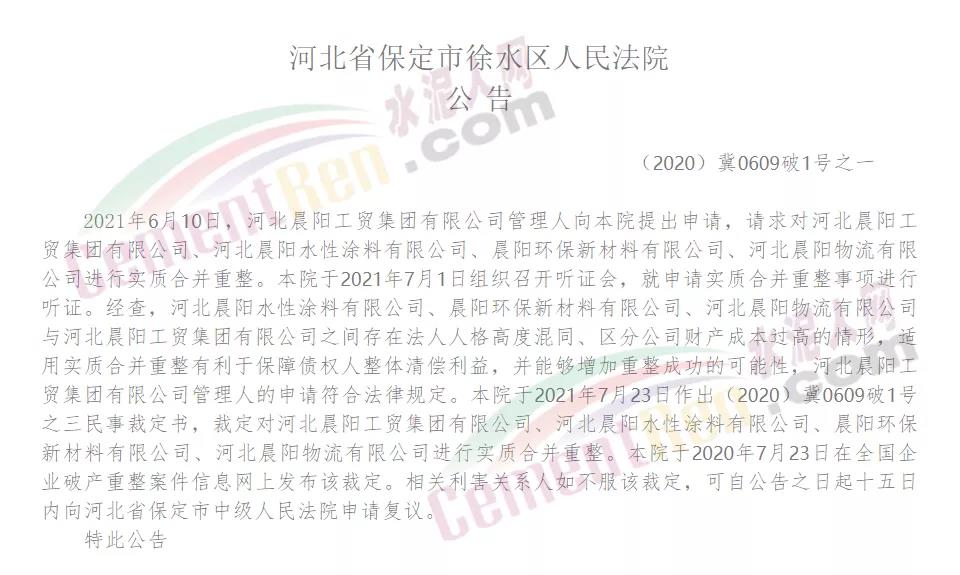 2021年6月10日,河北晨陽工貿集團有限公司管理人向徐水區人民法院提出申請,請求對河北晨陽工貿集團有限公司、河北晨陽水性涂料有限公司、晨陽環保新材料有限公司、河北晨陽物流有限公司進行實質合并重整。經過一個多月的論證評估,于2021年7月23日作出(2020)冀0609破1號之三民事裁定,對河北晨陽工貿集團有限公司、河北晨陽水性涂料有限公司、晨陽環保新材料有限公司、河北晨陽物流有限公司進行實質合并重整。