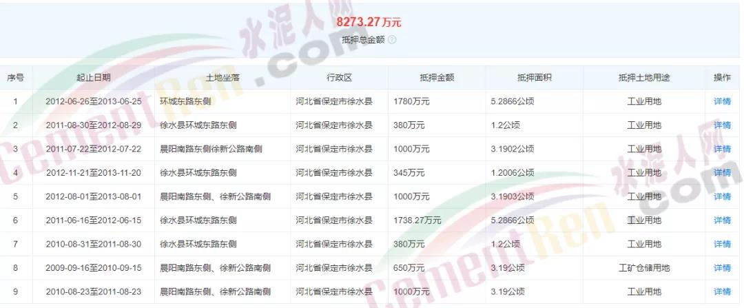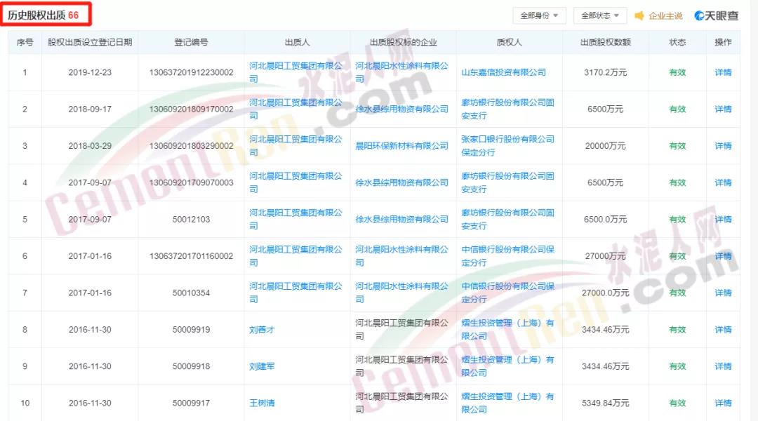 另據水泥人網了解,自2012年以來,在10年時間里,晨陽股權出質高達66次,涉及金額達上百億。進行土地抵押9次,涉及金額8273.27萬元……