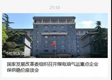21:10分《國家發(fā)展改革委組織召開煤電油氣運重點企業(yè)保供穩(wěn)價座談會》,提到發(fā)改委將推出八大舉措促進煤電油氣運重點企業(yè)保供穩(wěn)價。