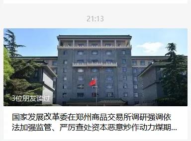 21:13分《國家發(fā)展改革委在鄭州商品交易所調研強調依法加強監(jiān)管、嚴厲查處資本惡意炒作動力煤期貨》提到,發(fā)改委將嚴厲查處資本惡意炒作動力煤期貨。