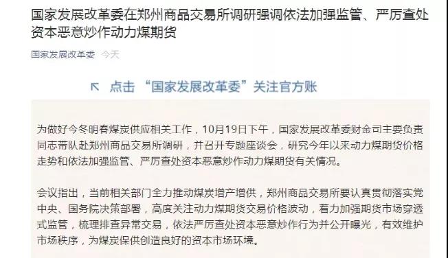 據了解,10月19日下午,國家發(fā)展改革委財金司主要負責同志帶隊赴鄭州商品交易所調研,并召開專題座談會,研究今年以來動力煤期貨價格走勢和依法加強監(jiān)管、嚴厲查處資本惡意炒作動力煤期貨有關情況。