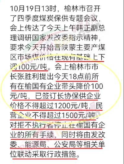 10月19日13時,榆林市召開了四季度煤炭保供專題會議,會上傳達了當日上午韓正副總理調研國家發(fā)改委指示精神,要求晉陜蒙主要產煤區(qū)市場煤價格在現有基礎上下調100元/噸。會上榆林市市長張勝利提出19日18點前所有在榆國有企業(yè)帶頭降價100元/噸,已簽訂長協(xié)保供企業(yè)價格不得超過1200元/噸,民營企業(yè)不得超過1500元/噸。對拒不執(zhí)行者停止在榆國有企業(yè)的所有手續(xù),同時將由發(fā)改委、能源局、公安局等相關單位聯(lián)動采取行政措施。