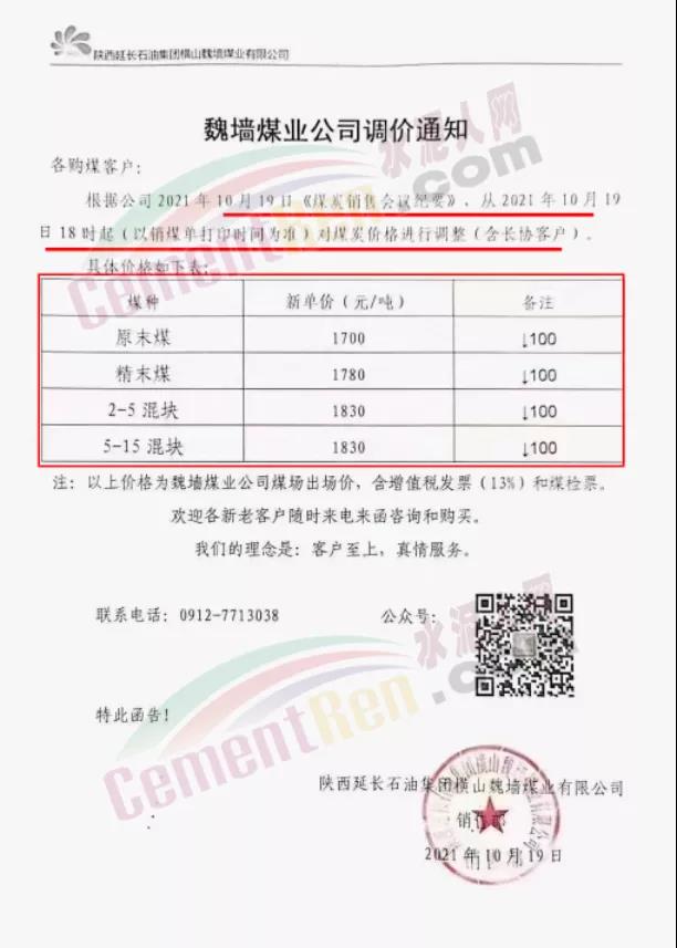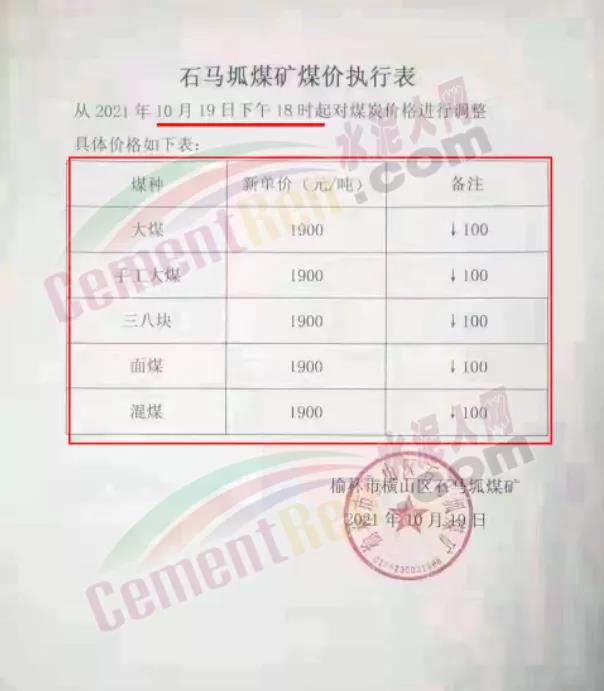 當日,榆林市橫山區(qū)石馬坬煤礦通知從2021年10月19日下午18時起對煤炭價格下調100元/噸,新單報價1900元/噸。