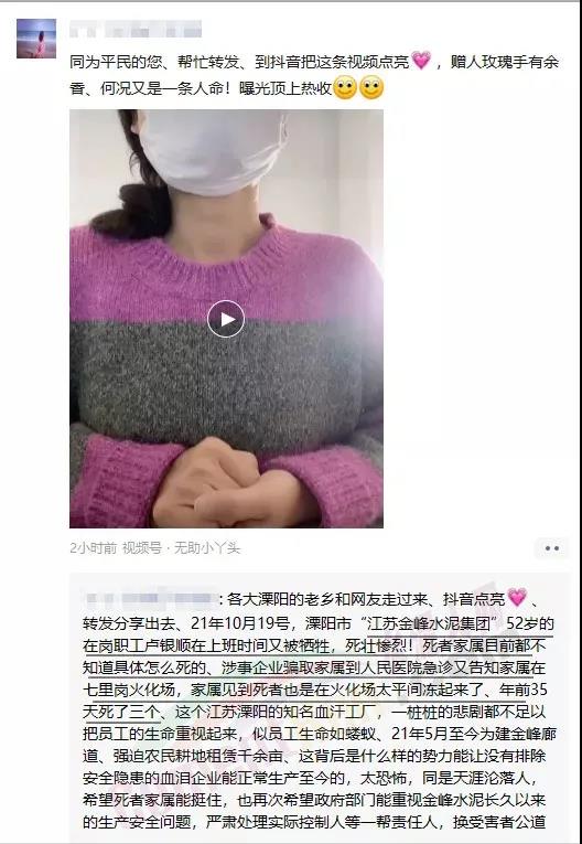 日前,網友“無助小丫頭”發布消息稱“2021年10月19號,溧陽市“江蘇金峰水泥集團”52歲的在崗職工盧銀順在上班時間又被犧牲,死壯(狀)慘烈!死者家屬目前都不知道具體怎么死的、涉事企業騙取家屬到人民醫院急診又告知家屬在七里崗火化場,家屬見到死者也是在火化場太平間凍起來了、年前35天死了三個。21年5月至今為建金峰廊道、強迫農民耕地租賃千余畝,這背后是什么樣的勢力能讓沒有排除安全隱患的血淚企業能正常生產至今的,同是天涯淪落人,希望死者家屬能挺住,也再次希望政府部門能重視金峰水泥長久以來的生產安全問題,嚴肅處理實際控制人等一幫責任人,換(還)受害者公道。”