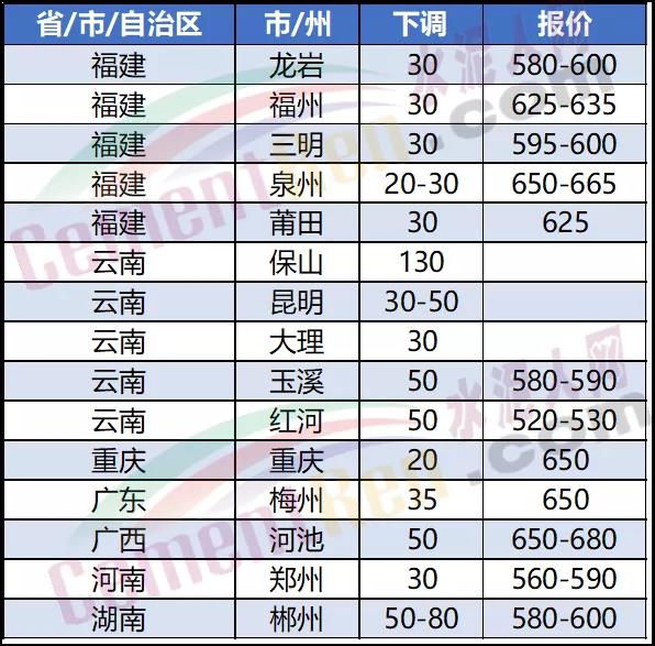 水泥人網通訊員消息,近期福建、云南、湖南省內多區域水泥價格下跌30-80元/噸。
