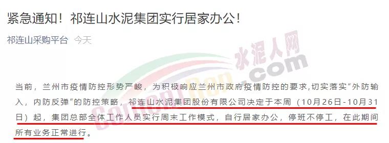 日前,祁連山水泥集團發緊急通知稱,當前蘭州市疫情防控形勢嚴峻,為積極響應蘭州市政府疫情防控的要求,切實落實“外防輸入,內防反彈”的防控策略,祁連山水泥集團股份有限公司決定于10月26日-10月31日起,集團總部全體工作人員實行周末工作模式,自行居家辦公,停班不停工,在此期間所有業務正常進行。