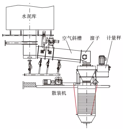 4.保留現有的控制閥門和斜槽,拆除斜槽頭部彎頭和下方的下料管道,保留現有的散裝機,在斜槽頭部加裝專用彎頭,彎頭下方安裝散裝計量秤,散裝計量秤與散裝機連接,更換散裝秤配套的控制系統。實現一次灌裝到位,散裝速度快,計量精度高,提高發運效率,減小現場揚塵。