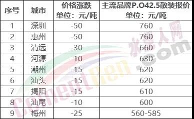 11月4日廣東省部分區域水泥價格漲跌一覽
