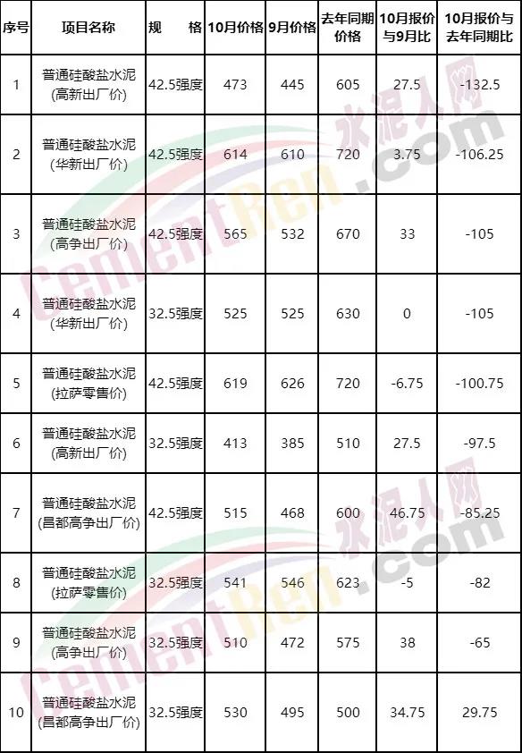 據10月末西藏發改委公布數據,高新、華新、高爭等多家企業32.5和42.5強度水泥與去年同期相比出現不同程度的下跌。其中,普通硅酸鹽水泥出廠價10月份報價較去年同期下跌相對較大。其中42.5強度高新跌132.5元/噸,華新下跌106.25元/噸,高爭下跌105元/噸;32.5強度,華新下跌105元/噸;拉薩地區42.5強度零售價下跌100.75元/噸。