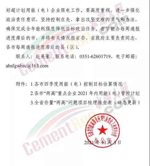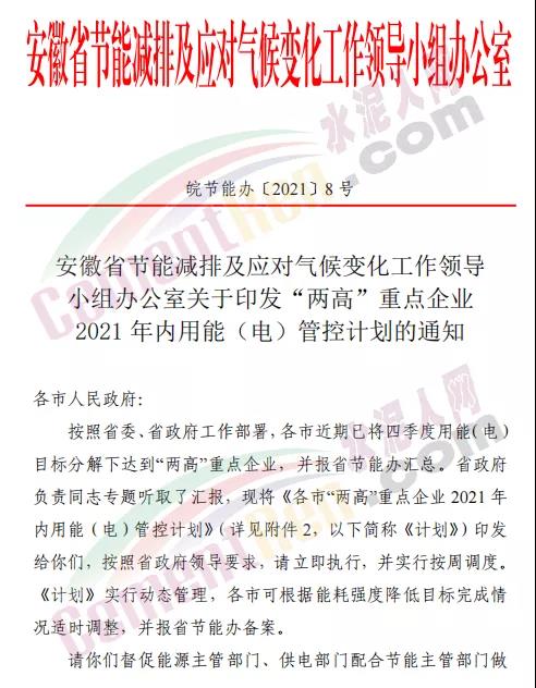 日前,安徽省節能減排及應對氣候變化工作領導小組辦公室發布《安徽省節能減排及應對氣候變化工作領導小組辦公室關于印發“兩高”重點企業2021年內用能(電)管控計劃的通知》要求各市人民政府督促能源主管部門、供電部門配合節能主管部門做好超計劃用能(電)企業限電工作。