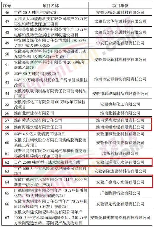 ?全省存量“兩高”問題項目梳理排查表中包含海螺水泥、南方水泥、鐵鵬水泥、眾城水泥旗下多個項目。