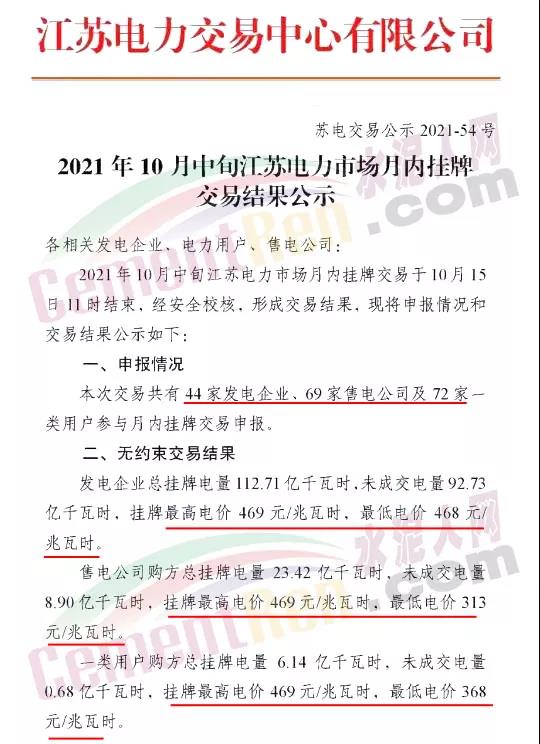 江蘇省10月中旬月內掛牌交易,共成交電量19.98億千瓦時,成交均價468.97元/兆瓦時,成交價較基準價上浮了19.94%。