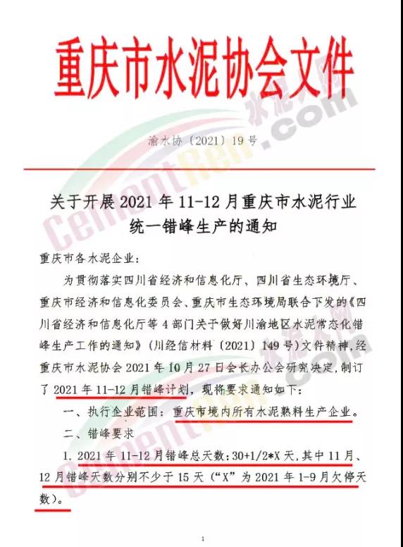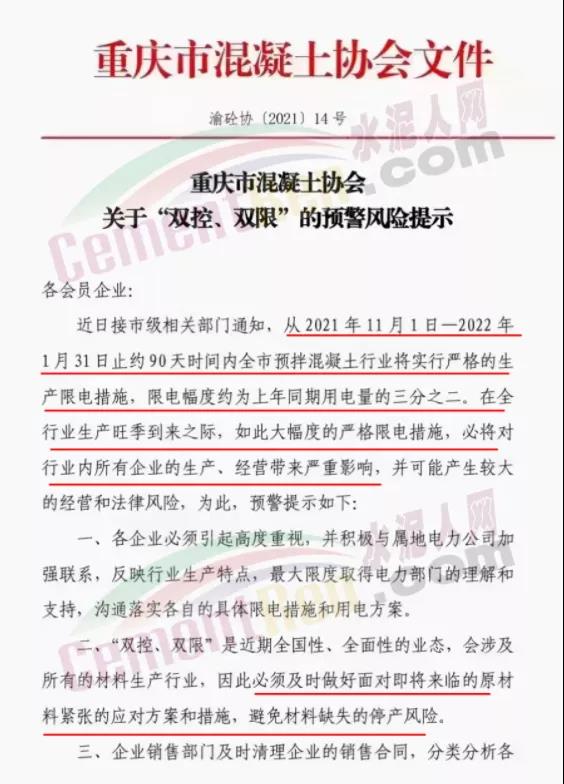 綜上所述,各地針對于高耗能企業的電價控制以及限電、限產要求加嚴,此前重慶市混凝土協會發布《關于“雙控、雙限”的預警風險提示》要求從 2021年11月1日~2022年1月31日止約90天時間內全市預拌混凝土行業將實行嚴格的生產限電措施,限電幅度約為上年同期用電量的三分之二。同期,重慶市水泥協會發文要求轄區水泥企業自11月1日起執行錯峰生產。水泥成本增加同時供應量減少,水泥價格應聲上漲100-150元/噸。但因下游商混企業同樣面臨限電限產,水泥價格提漲落實情況不理想。