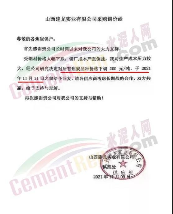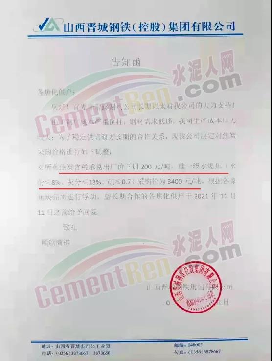 山西晉城鋼鐵控股集團有限公司告知函稱,由于鋼材成本嚴重倒掛,鋼材需求低迷,企業(yè)生產(chǎn)成本壓力較大。為了穩(wěn)定供需雙方長期的合作關(guān)系,企業(yè)決定對焦炭采購價格進行調(diào)整。對所有焦炭含稅承兌出廠價下調(diào)200元/噸。