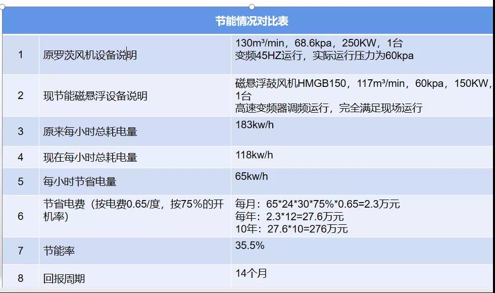 實(shí)際運(yùn)行情況表明,華東風(fēng)機(jī)3臺風(fēng)機(jī)均可達(dá)到生產(chǎn)所需風(fēng)量風(fēng)壓等要求,運(yùn)行平穩(wěn),噪音低,節(jié)能效果顯著,每小時(shí)可節(jié)省電量65kw/h,節(jié)能率35.5%,按電費(fèi)0.65元/度,75%的開機(jī)率計(jì)算,平均每月可節(jié)省電費(fèi)2.3萬元。具體節(jié)能情況如下表: