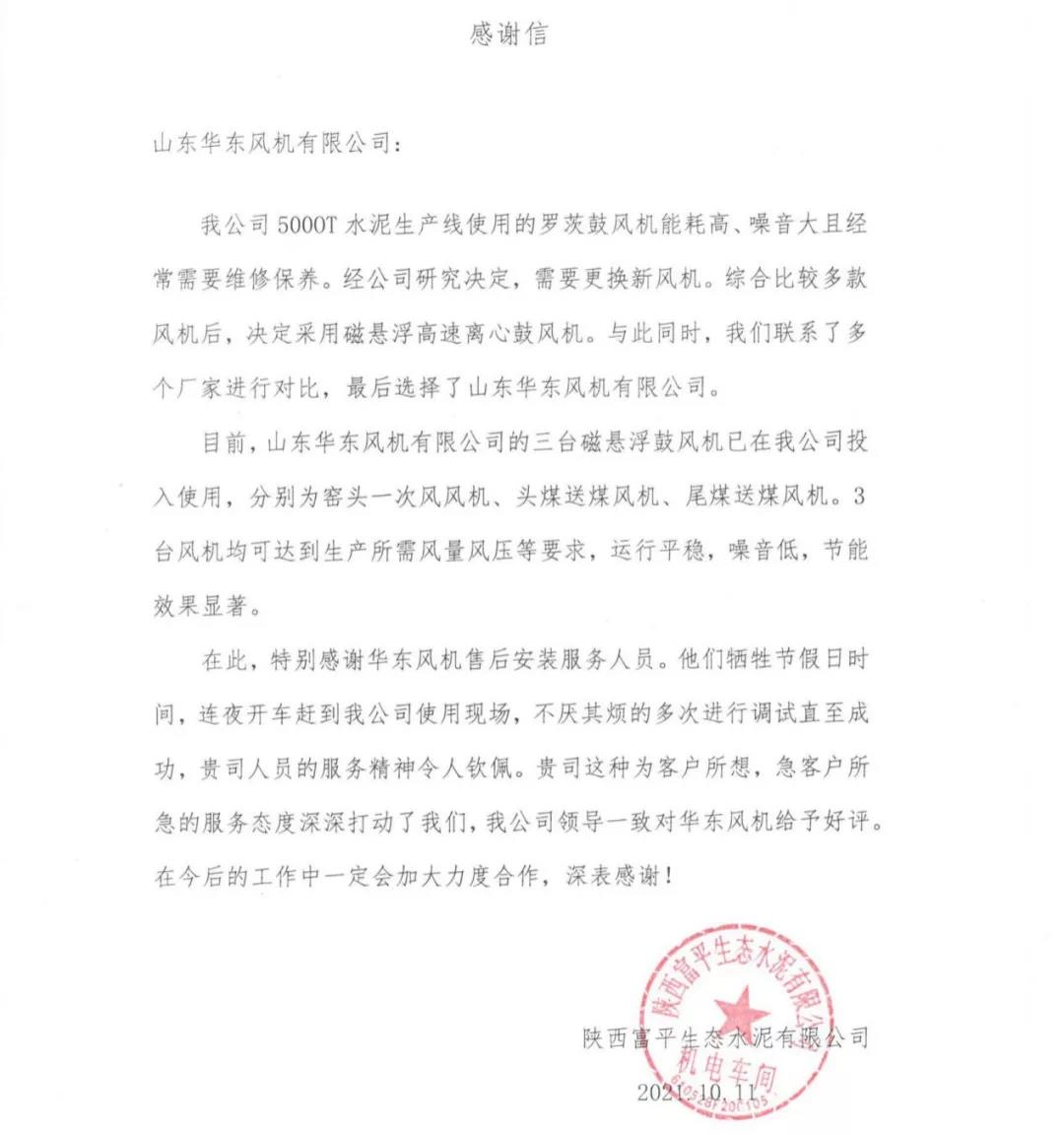 憑借專業(yè)的技術(shù)團(tuán)隊(duì)、現(xiàn)代化的加工設(shè)備、完善的售后服務(wù),華東風(fēng)機(jī)幫助富平生態(tài)水泥在提高能源利用效率、降低企業(yè)綜合能耗等方面取得了突破性的進(jìn)步,為此,富平生態(tài)水泥特向華東風(fēng)機(jī)寄來了感謝信。