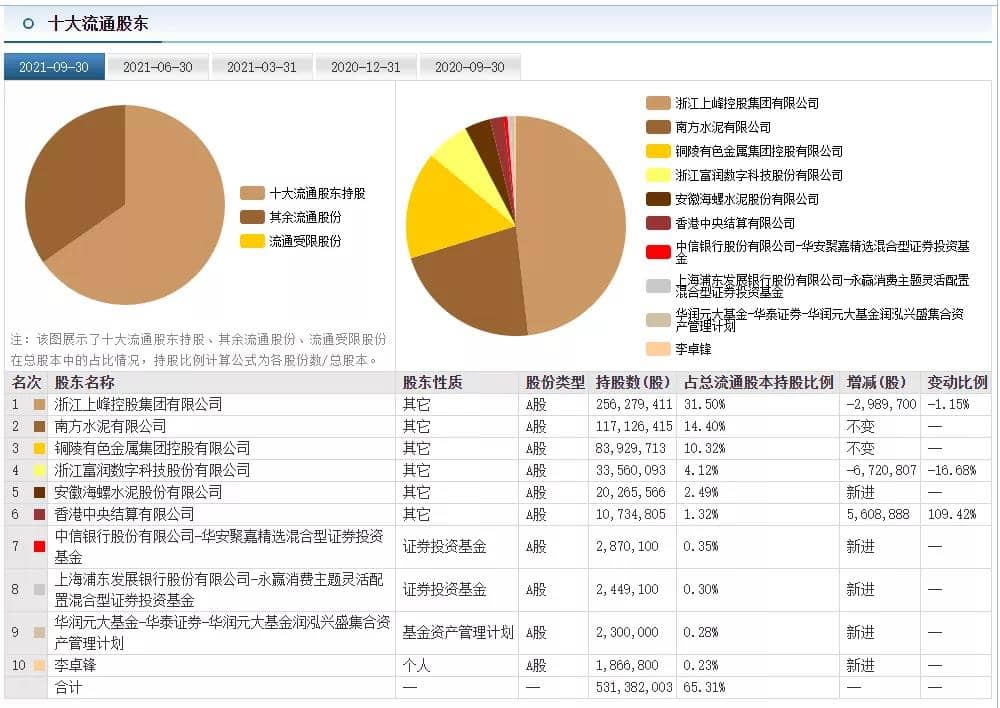 上峰水泥三季報顯示,海螺水泥在今年第三季度新進成為公司第5大股東,持股比例為2.49%。