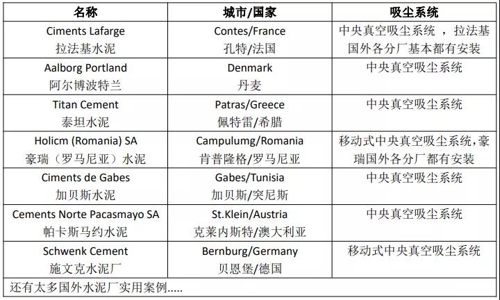 水泥人網了解,在世界范圍內,目前最有效、最高效的粉塵清潔方式,采用純吸的方式(純吸無揚塵,無二次污染),可高效快速的吸走粉塵,一次徹底清掃,杜絕二次污染,一套系統可抵多套普通吸塵器,可降低企業生產成本,提高生產效率,減少人力物力,實現清潔生產。該套系統在國外水泥廠各車間都是標配設備,為此小編特意查閱了世界水泥工廠使用案例,真是不勝枚舉,在此先簡單羅列幾個。