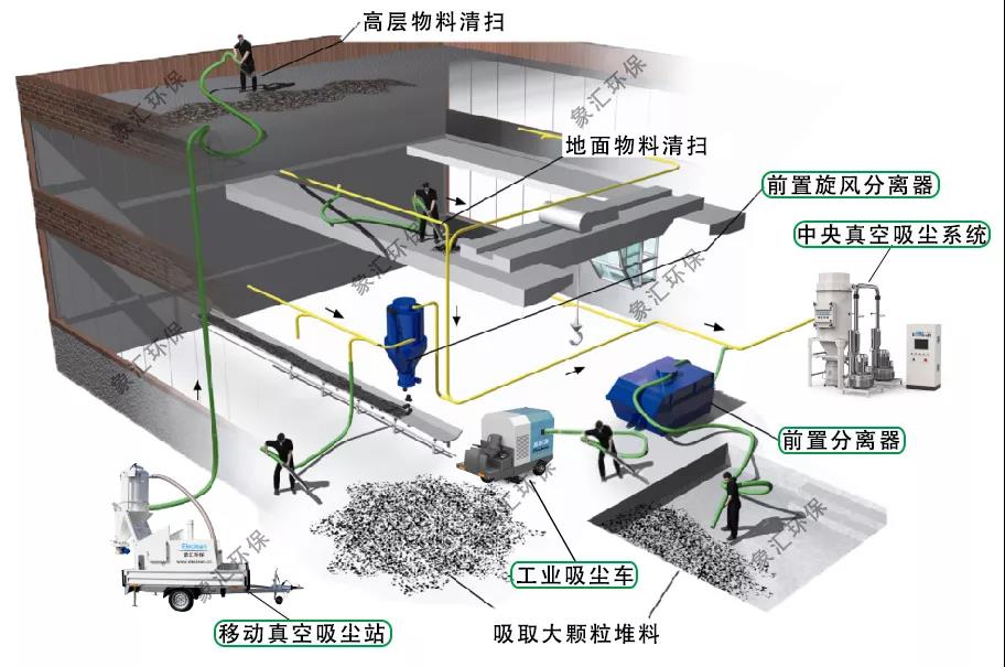 中央真空吸塵系統是工業粉塵治理設備的非常重要的配置之一,象匯環保中央真空吸塵系統自推出市場以來,隨著技術不斷提高,在水泥行業應用也愈來愈廣泛。該系統將在水泥行業包裝車間、研磨區和粉碎區、水泥庫、煤磨車間和輸煤皮帶廊道等多個區域應用。針對面積廣,多樓層需要清掃,揚塵較多的工廠,一套系統就可搞定整廠粉塵清掃問題,具有以下突出特點: