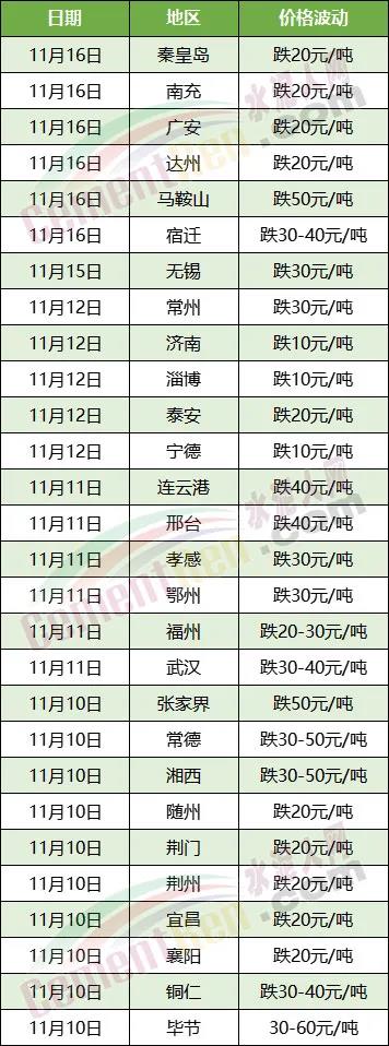 水泥消費核心區域跌價,引發大面積的價格塌方。11月中旬以來湖南、安徽、廣西、湖北、四川、貴州、福建、山東、河北等十幾個省水泥價格陸續下跌。