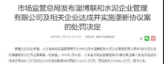 據(jù)了解,今年2月9日國家市場監(jiān)督管理總局反壟斷局發(fā)布淄博聯(lián)合水泥企業(yè)管理有限公司及相關(guān)企業(yè)達(dá)成并實施壟斷協(xié)議案的處罰決定。2021年1月28日,山東省市場監(jiān)督管理局對8家涉案當(dāng)事人依法作出沒收違法所得8657.2萬元并處2018年度銷售額2%的罰款計14172.3萬元,罰沒款共計22829.5萬元。