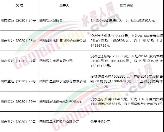 四川省市場監(jiān)督管理局發(fā)布6條《行政處罰決定書》。其中針對于當(dāng)?shù)厮嘈袠I(yè)的處罰決定書提到案件來源及調(diào)查經(jīng)過為:2017年7月,四川省發(fā)展和改革委員會從多個途徑收到反映四川省水泥協(xié)會組織本行業(yè)經(jīng)營者聯(lián)合漲價的舉報。經(jīng)初步核查后,四川省發(fā)展和改革委員會于2017年7月20日正式對四川省水泥協(xié)會及涉嫌達(dá)成并實施壟斷協(xié)議的六家水泥經(jīng)營者予以立案調(diào)查,總計處罰3506.9572萬元。