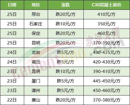 近期河北、福建、云南等多區域混凝土價格持續下跌,河北邢臺、石家莊、保定、唐山跌20元/方,C30混凝土報價350-410元/方。
