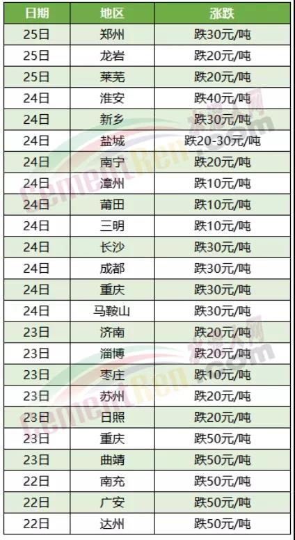 湖北宜昌,受外來水泥沖擊較大,已連續多次下調水泥價格,23日再次下調30-50元/噸,自10月下旬以來,累計降價達80-100元/噸。