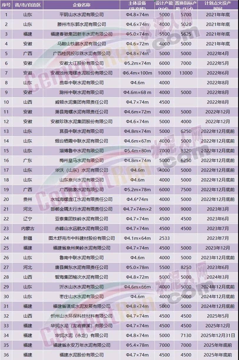 同時,有大量的智能化高產水泥生產線陸續建成投產。據不完全統計從2021年至2025年底前將有37條5340.9萬噸/年。新型干法水泥熟料生產線點火投產。擬于2021年12月-2025年12月期間點火投產部分生產線如下: