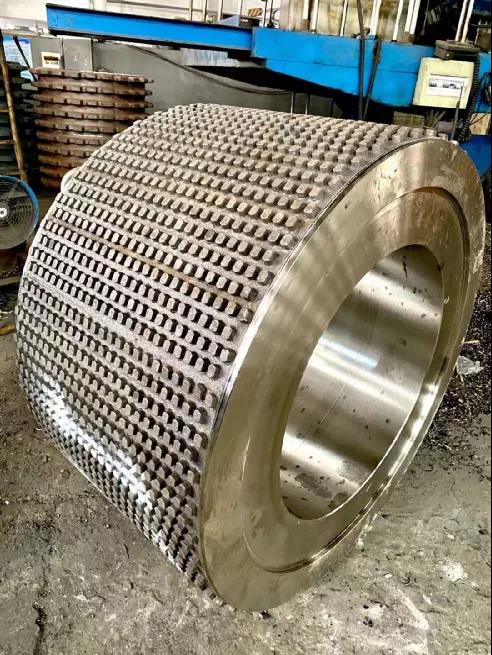 8、鑲鑄陶瓷合金棒復(fù)合輥比目前市場上使用的柱釘復(fù)合輥優(yōu)勢明顯,柱釘復(fù)合輥是在輥套上鉆孔,用膠合劑粘柱釘敲入輥套中使用,但經(jīng)不起原料溫度的變化,柱釘會脫落,造成擠壓輥產(chǎn)量和質(zhì)量的降低。而鑲鑄陶瓷合金棒復(fù)合輥經(jīng)過鋼水熱復(fù)合解決了合金棒的脫落現(xiàn)象,充分提高設(shè)備的繼續(xù)使用,降低修復(fù)成本提高產(chǎn)能,起到了很好的效果。