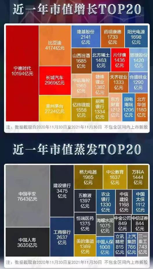 日前,A股市值增長排行榜成為熱議話題,除去期間上市新股,截止到11月30日寧德時代、比亞迪、長城汽車、貴州茅臺、隆基股份近一年市值增長居前五,且均超2000億。與此同時,中國平安、中國人壽、建設銀行、工商銀行、格力電器近一年市值蒸發居前五。水泥行業龍頭企業海螺水泥市值蒸發1075億也登上了市值蒸發TOP20榜單。